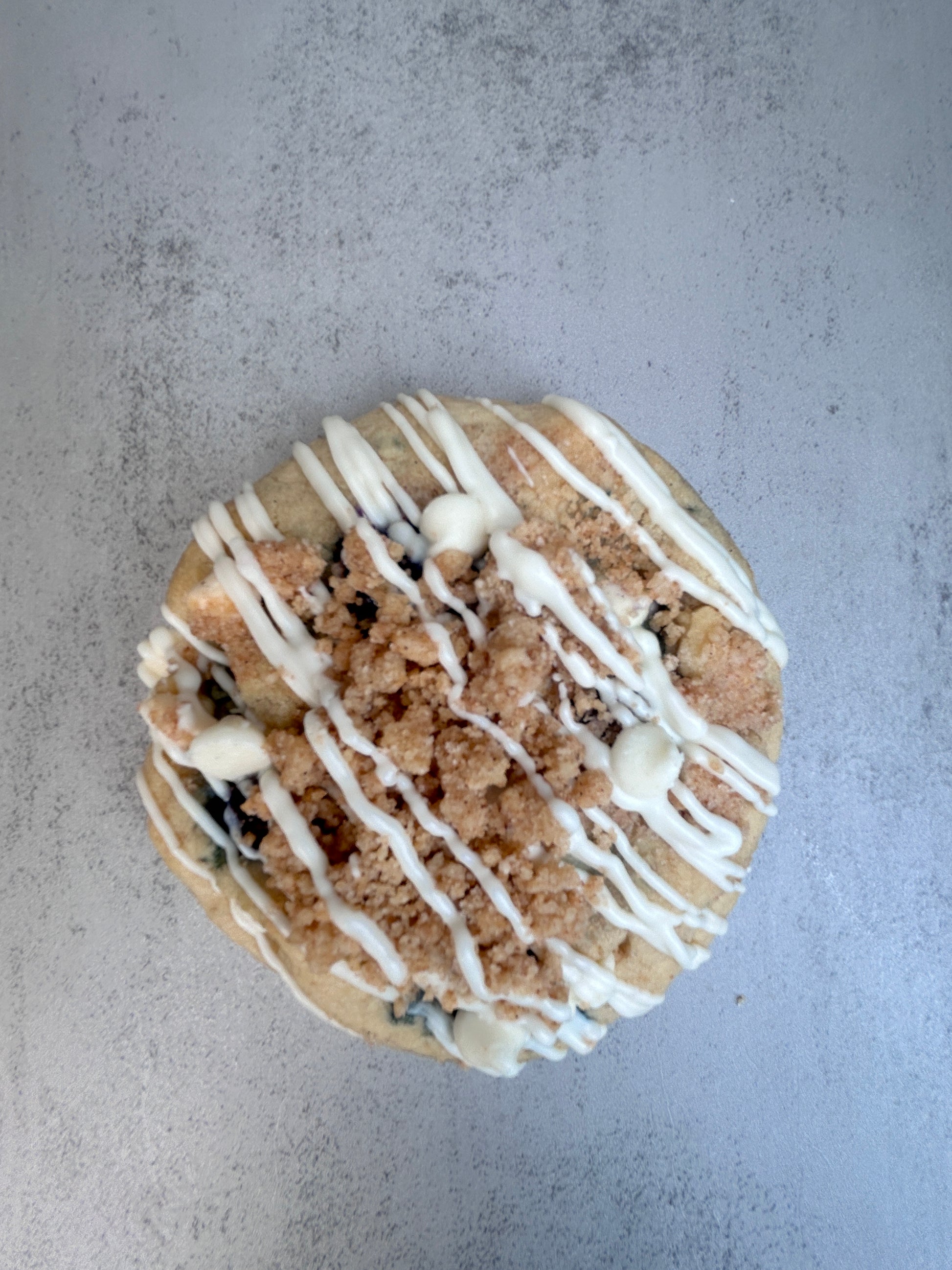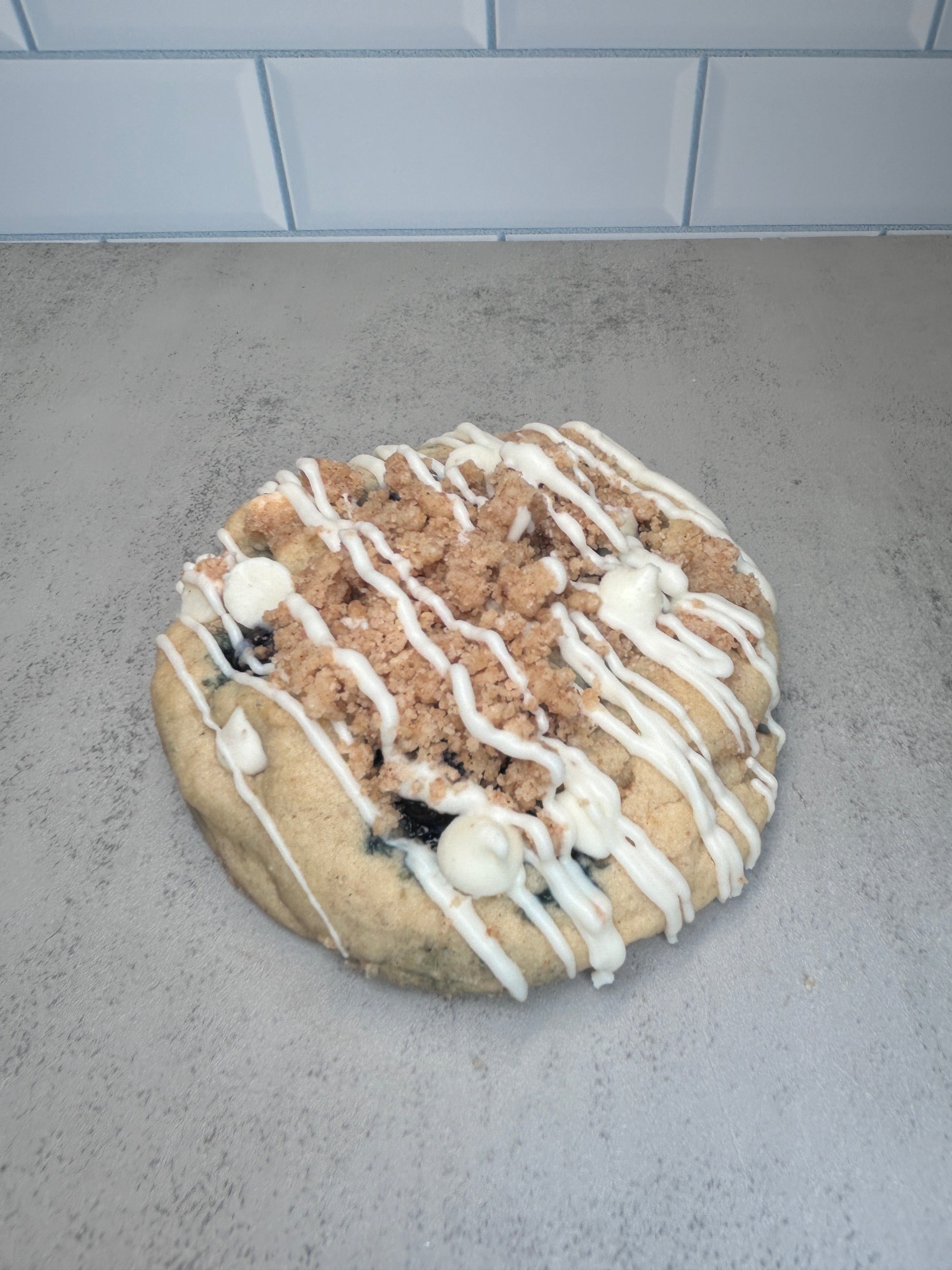 Our Blueberry Crumb Cookie is the perfect blend of comfort and luxury. Made with real blueberries, this soft and chewy cookie delivers a burst of fruity sweetness in every bite. The rich butterly cookie base is topped with a buttery spiced brown sugar crumb topping, creating the perfect balance of texture and flavor, all seal with the white chocolate drizzle kiss!